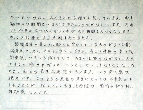 このような患者は先生にとっては不本意かもしれませんが、私にとって長生治療院は、最後の切り札、特効薬なんです。
